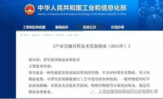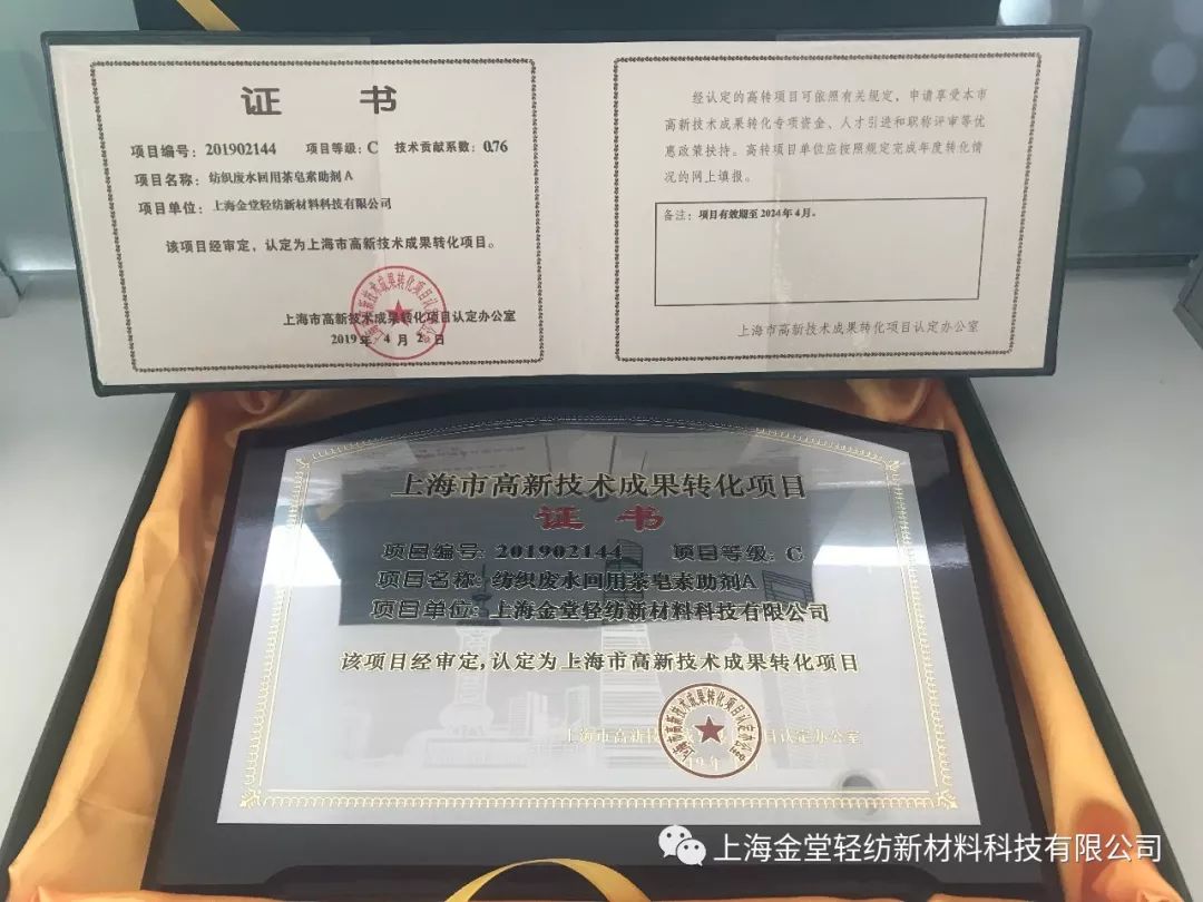 ? ? ? 為解決印染織物前處理頑疾,助推印染行業(yè)健康、綠色、可持續(xù)發(fā)展,上海金堂輕紡新材料科技有限公司十年磨一利劍,成功開發(fā)卜公茶皂素助劑,并于近日喜獲2019年第2批上海市高新技術(shù)成果項(xiàng)目認(rèn)證。