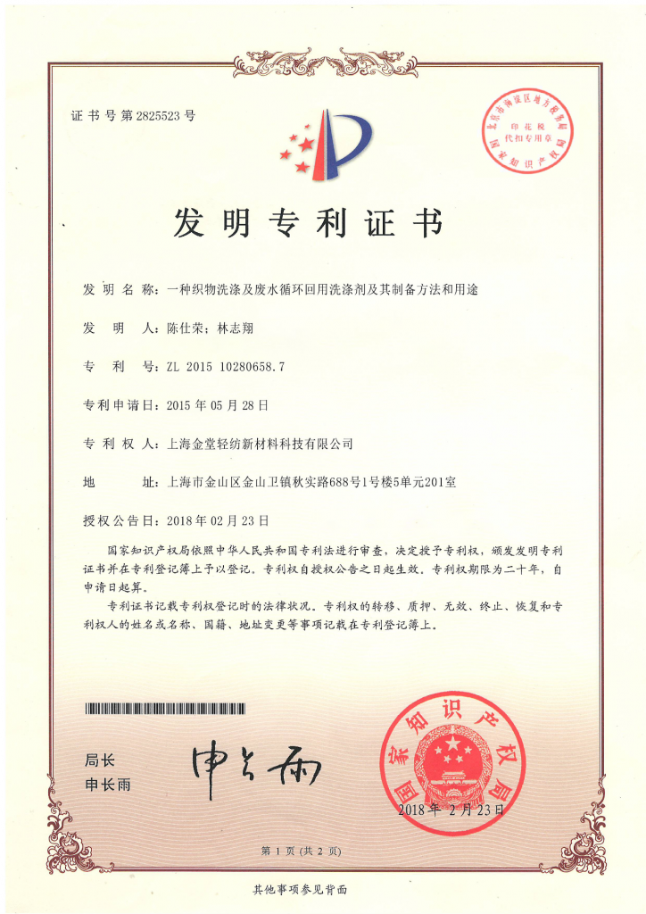 摘要:本發(fā)明公開了一種織物洗滌及廢水循環(huán)回用洗滌劑及其制備方法和用途。該洗滌劑由茶皂素、雙氧水與水調(diào)配而成;其中,茶皂素5%~30%,雙氧水5%~20%,其余為水。本發(fā)明的洗滌劑可用于織物首次洗滌,并添加在之后得到的織物洗滌廢水中,即可使廢水再生,循環(huán)回用。本發(fā)明的洗滌劑為高效的織物洗滌劑產(chǎn)品,生態(tài)環(huán)保,減少化學品的使用,并免加燒堿、次氯酸鈉、洗衣粉等各類化學品,而且使用時不必再添加其他有害化學品即可滿足織物洗滌潔凈工藝要求,同時減少新鮮水用量和減少洗滌工序廢水排放,又大幅度降低生產(chǎn)成本,同時節(jié)省工時,并避免設(shè)備腐蝕和織物損傷,提高洗滌產(chǎn)品質(zhì)量,保證人身安全,實現(xiàn)生態(tài)環(huán)?;踩a(chǎn)作業(yè)。