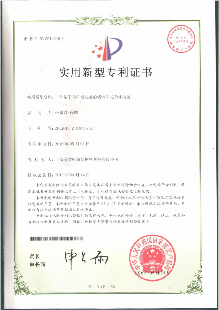 摘要:本實用新型公開了一種基于EST皂洗劑的活性印花節(jié)水裝置,包括平幅印染機,平幅印染機內(nèi)設有印染輥、壓水輥、支撐輥、蒸汽噴頭及攪拌葉輪,攪拌葉輪引出與電機傳動連接,平幅印染機下端與第一水箱聯(lián)通,第一水箱上端蒸汽管貫穿汽蒸機后與蒸汽噴頭上端連接;汽蒸機下端與第二水箱連接,汽蒸機上端與換熱器連接,換熱器與水洗機連接;水洗機內(nèi)設有超聲波振蕩器、水洗輥和噴淋輥,噴淋輥上設有噴淋腔,噴淋腔上裝有高壓噴頭,噴淋腔與高壓水管連接;水洗機與循環(huán)箱連接,循環(huán)箱與第二水箱連接;本實用新型占地面積小,印染流程短效率高,運營消耗小,廢水排放少,對印染行業(yè)生態(tài)環(huán)保生產(chǎn)的推廣起到了積極作用。