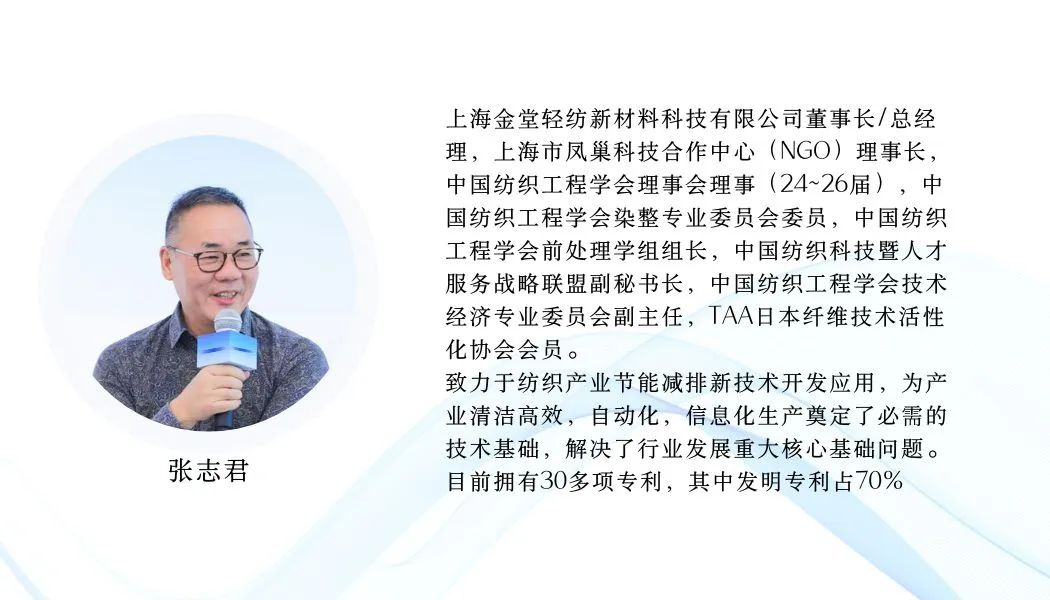 ? ? ? 張志君提出,作為團體標(biāo)準(zhǔn)先行企業(yè),上海金堂認(rèn)識最為深刻的是,紡織印染行業(yè)ESG核心風(fēng)險是落后工藝,印染高質(zhì)量可持續(xù)發(fā)展,核心在于前處理,新技術(shù)工藝與傳統(tǒng)工藝相比優(yōu)勢在于減少纖維損傷 (氧化破洞),縮短工藝流程,產(chǎn)品質(zhì)量提升,廢水循環(huán)回用;生產(chǎn)綜合成本降低,打開企業(yè)生存發(fā)展空間。