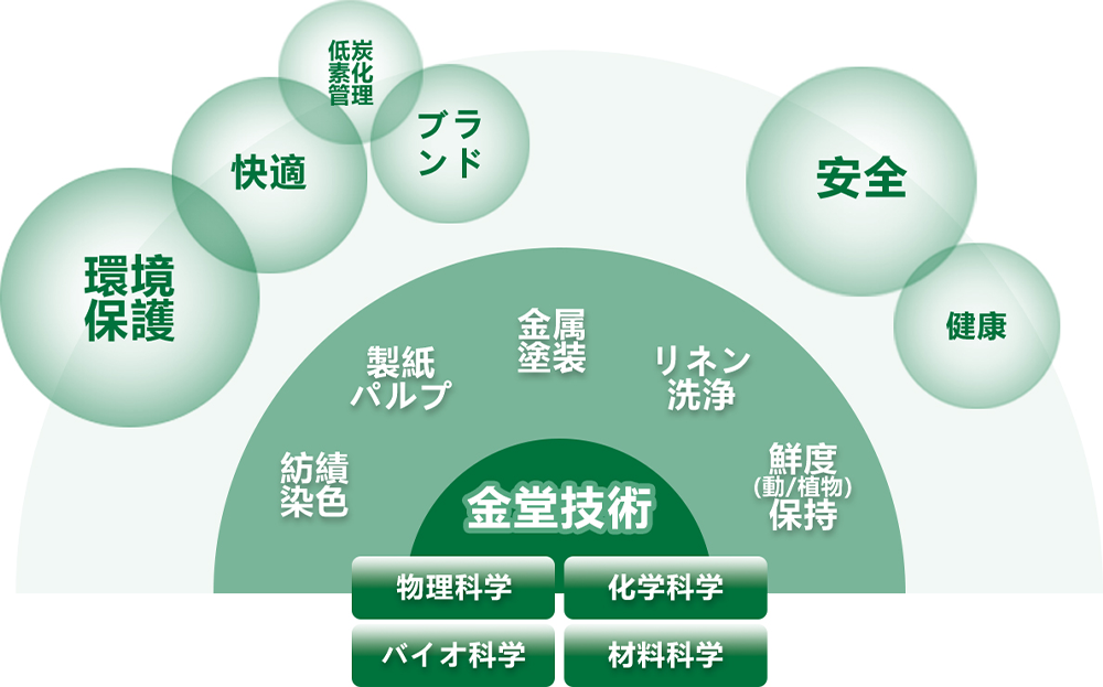 植物繊維捺染におけるピンホール発生や強(qiáng)度低下低減などの研究開(kāi)発からスタートし、上海金堂は獨(dú)自技術(shù)を通じて様々な新製品を開(kāi)発した。現(xiàn)在、アパレル、建材、金屬表面処理、リネ?クリーニング、物流などの各分野で製品展開(kāi)及び関連サービスを開(kāi)拓している。